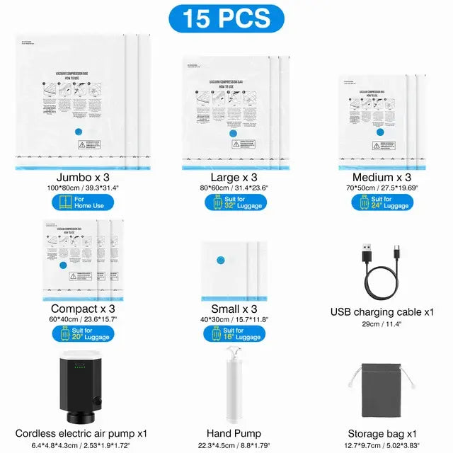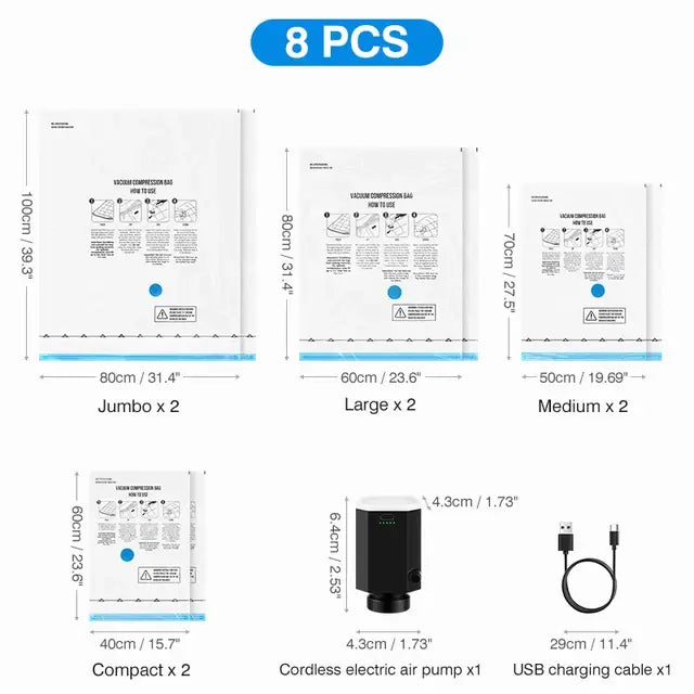 Say goodbye to manual compression struggles with our electric pump. The included electric pump quickly and easily removes air from the storage bags, significantly reducing their volume and making your packing process a breeze.